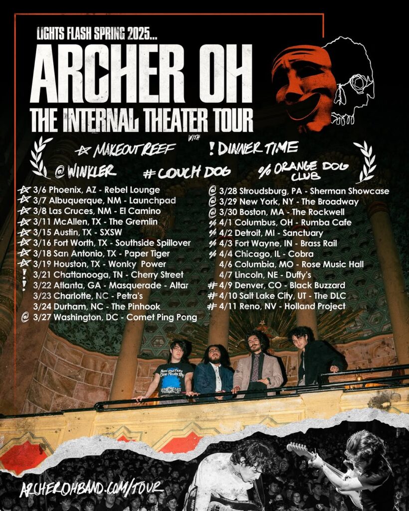 California indie garage rock band Archer Oh (lead vocalist and guitarist Arturo “Archie” Medrano, drummer Pedro Hernandez, guitarist Diego Jacuinde, and bassist Juan Cabrera) recently released their excellent new studio album, The Internal Theater via AWAL/Sony. Engineered by Sean Cook at John Congleton’s Los Angeles studio, Animal Rites, and mastered by Howie Weinberg, the album unleashes a deeper, more evolved sound from the group. Through a flurry of moody melodies and passionate riffs, The Internal Theater unpacks inner conflict and the coming of age feelings and confusion of what one expects of themselves, versus what is expected of them by society.